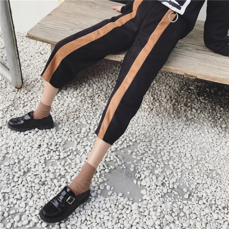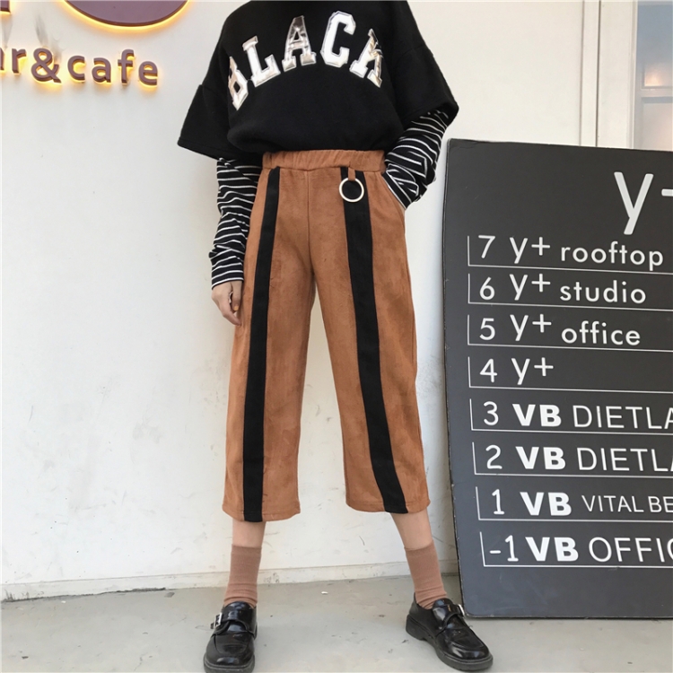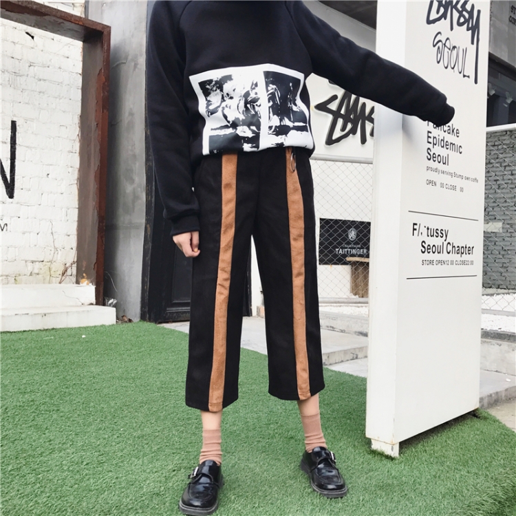 秋冬韓國百搭高腰九分褲直筒褲麂皮絨撞色豎條紋顯瘦休閑褲女