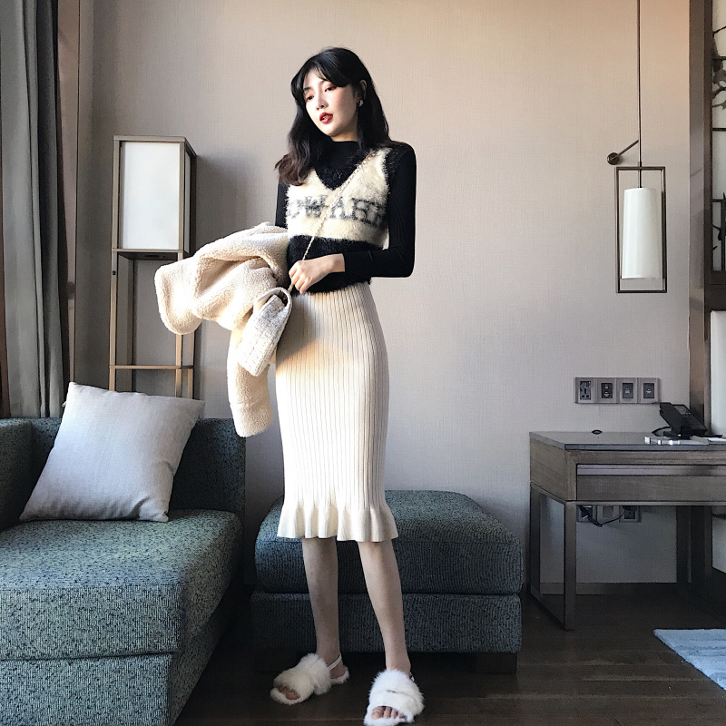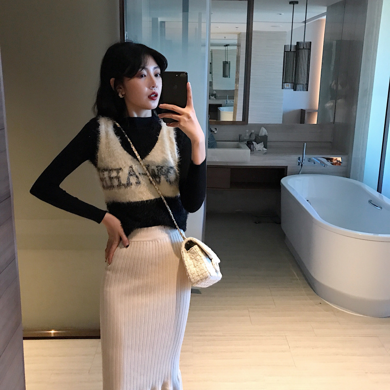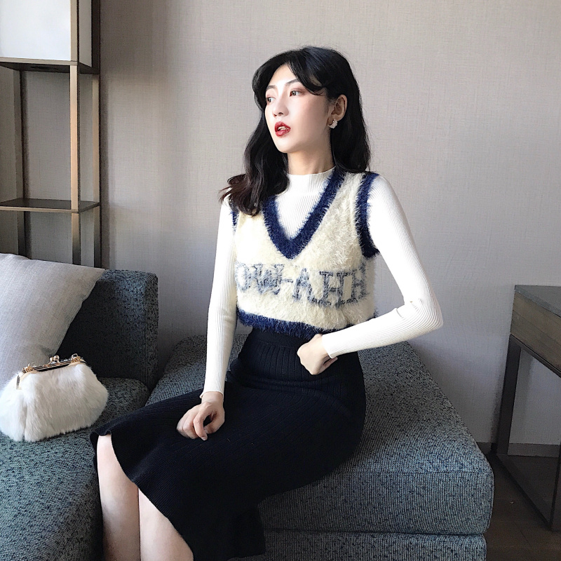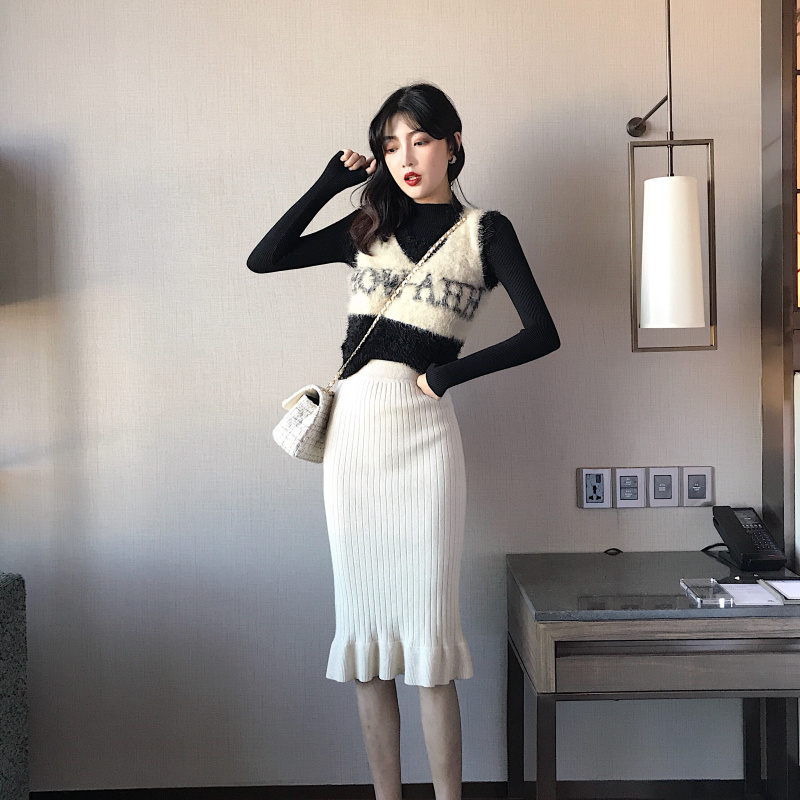 2018韓版新款秋冬百搭毛毛針織馬甲背心打底衫針織包臀裙時尚套裝