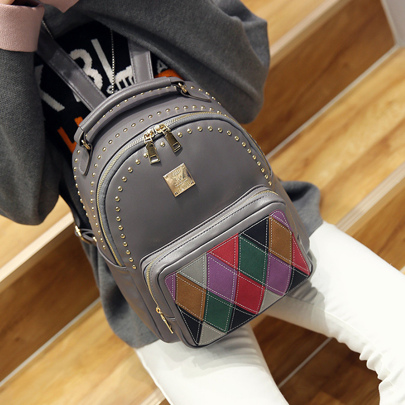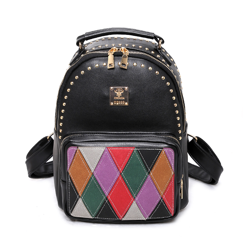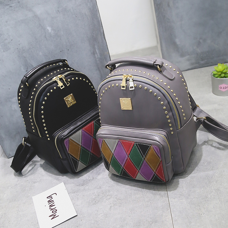 包包新款韓版撞色雙肩包女鉚釘拼接休閑背包學院風迷你小書包