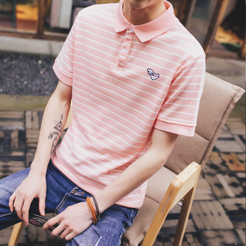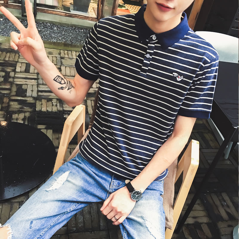 / 2017夏季新款潮流韓版修身休閑翻領條紋短袖T恤大碼男士青少年裝