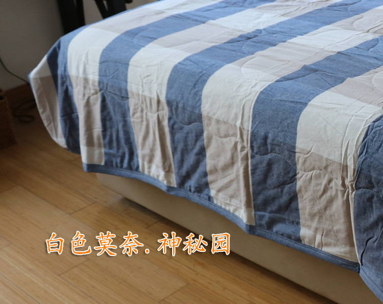 關于她:潔凈的色調,瞬間點亮居室的氣氛,簡潔明快的設計,簡約不簡單的拼布風格,抒寫仲夏記憶……此款為出口原單富有異國情調,經典條紋格質量比一般款式夏涼被質量要好很多,手感舒適,可用作床蓋,夏季薄被等等……