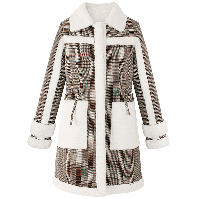 MG小象皮毛一體大衣女中長款寬松冬季新款2018流行格子毛呢外套潮