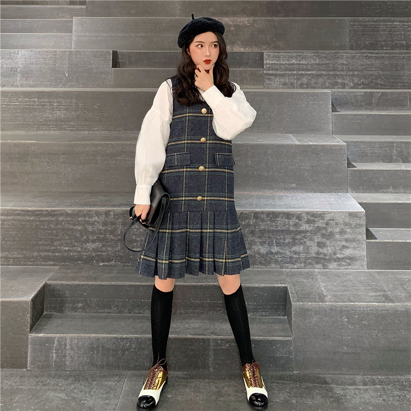 復古v領無袖格子連衣裙時尚套裝港味網紗喇叭袖襯衫上衣兩件套女