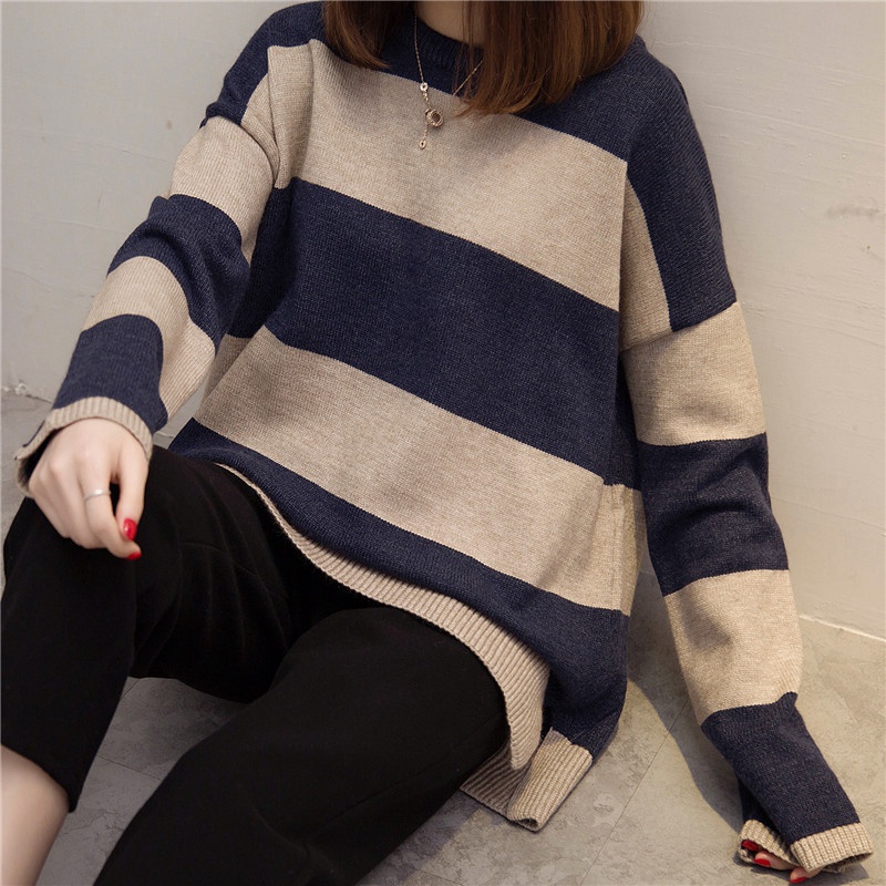 冬裝新款套頭毛衣女條紋韓版寬松學生針織衫打底衫秋冬女裝潮