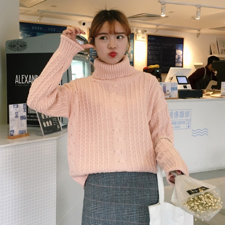 / 冬款韓國甜美高領套頭長袖卷邊加厚麻花寬松學生毛線毛衣女