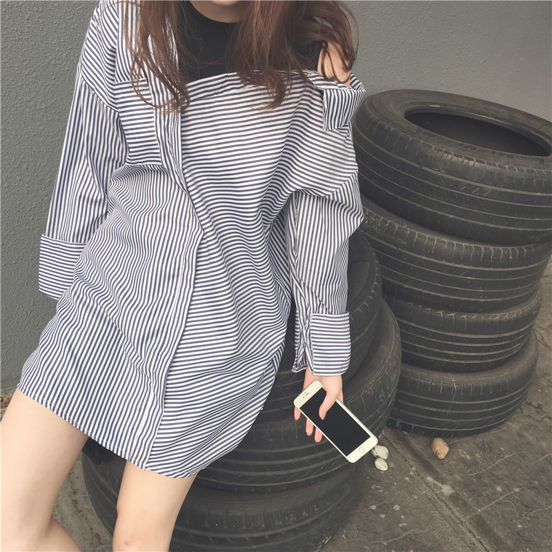 復古寬松條紋假兩件襯衫女長袖2017春秋新款韓國短款襯衣露肩上衣