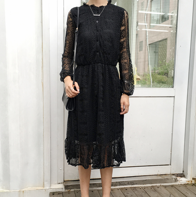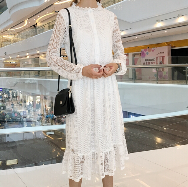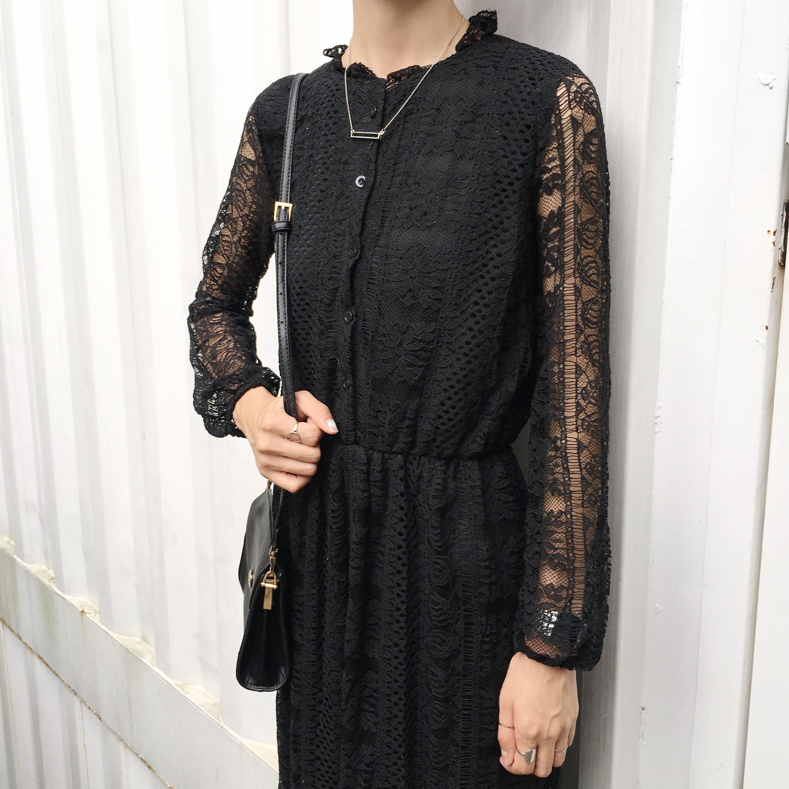 / 秋裝新款韓版百搭中長款純色休閑寬松顯瘦裙子蕾絲長袖連衣裙