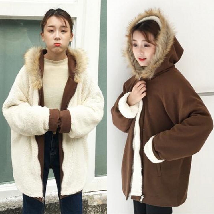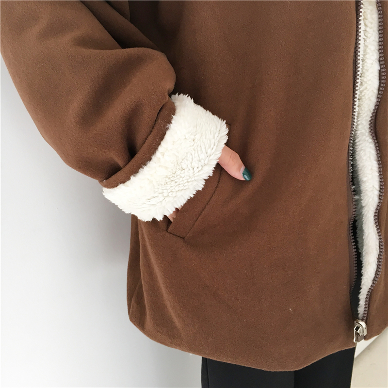 冬款韓國兩面穿chic連帽毛毛領呢子羊羔毛保暖棉衣外套棉服女