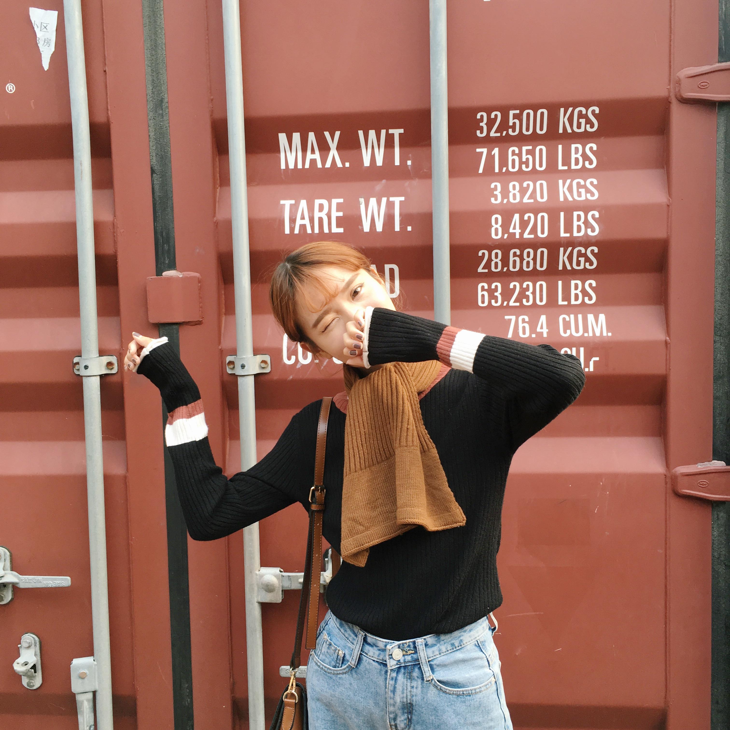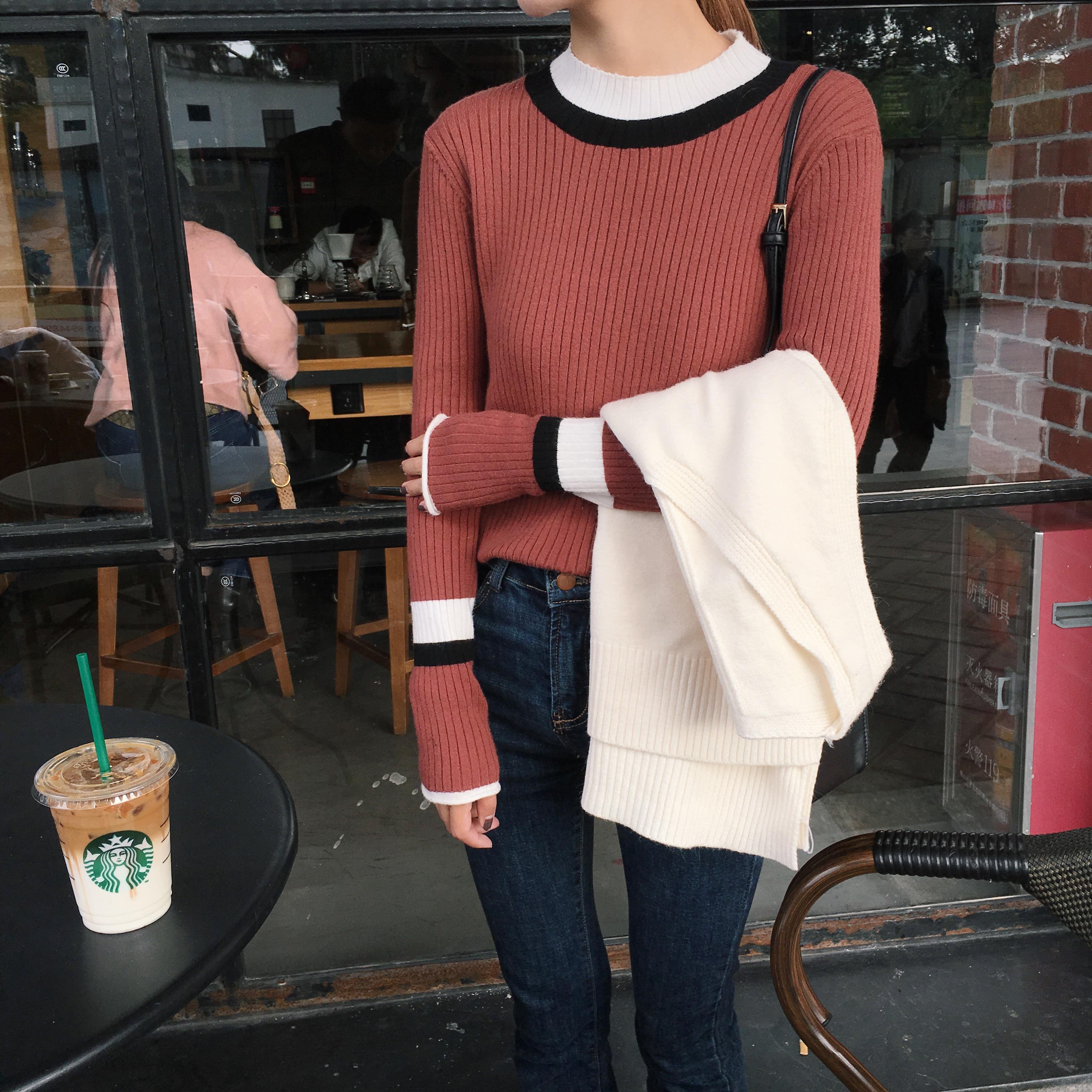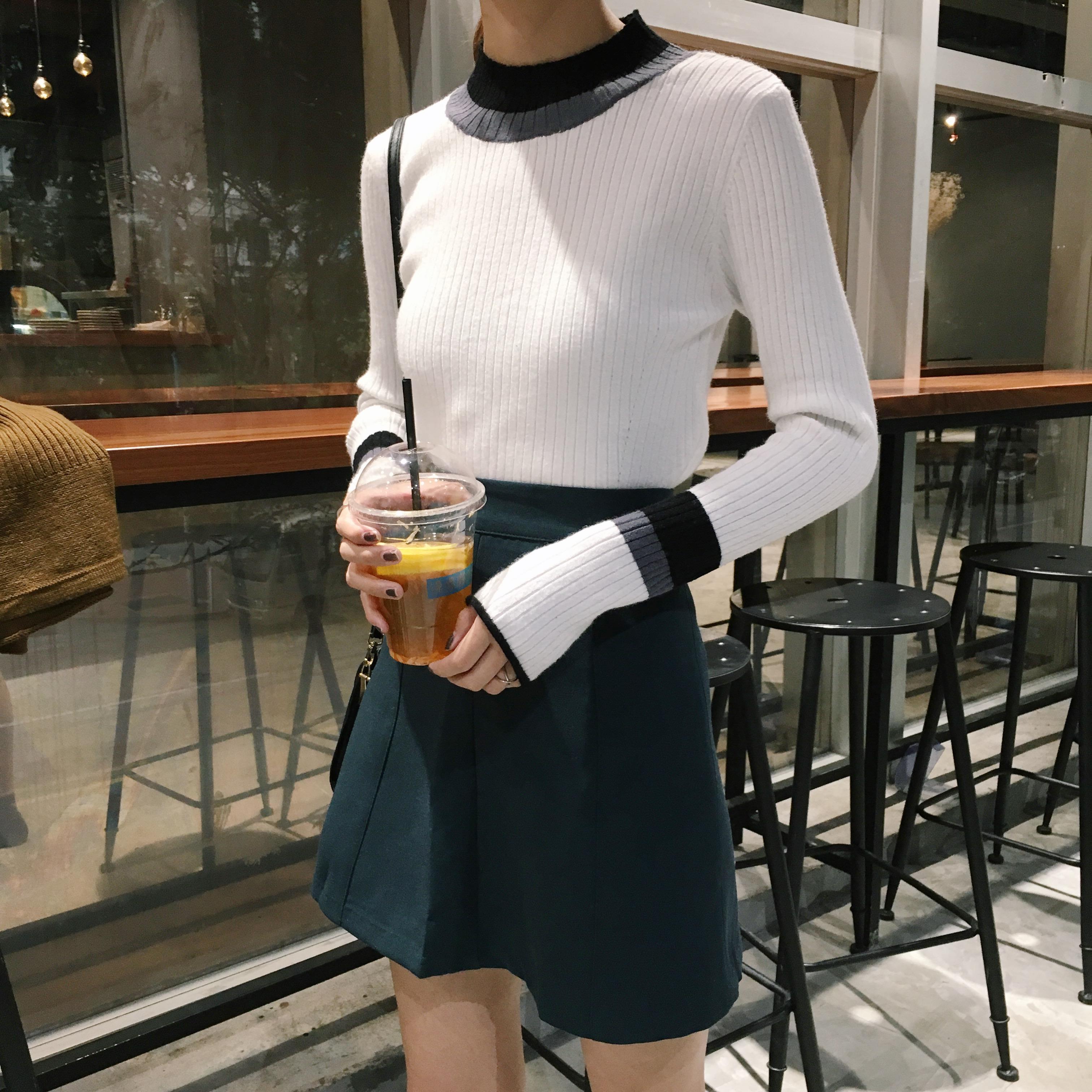 韓國chic秋冬撞色半高領修身彈力打底衫套頭長袖螺紋針織衫女