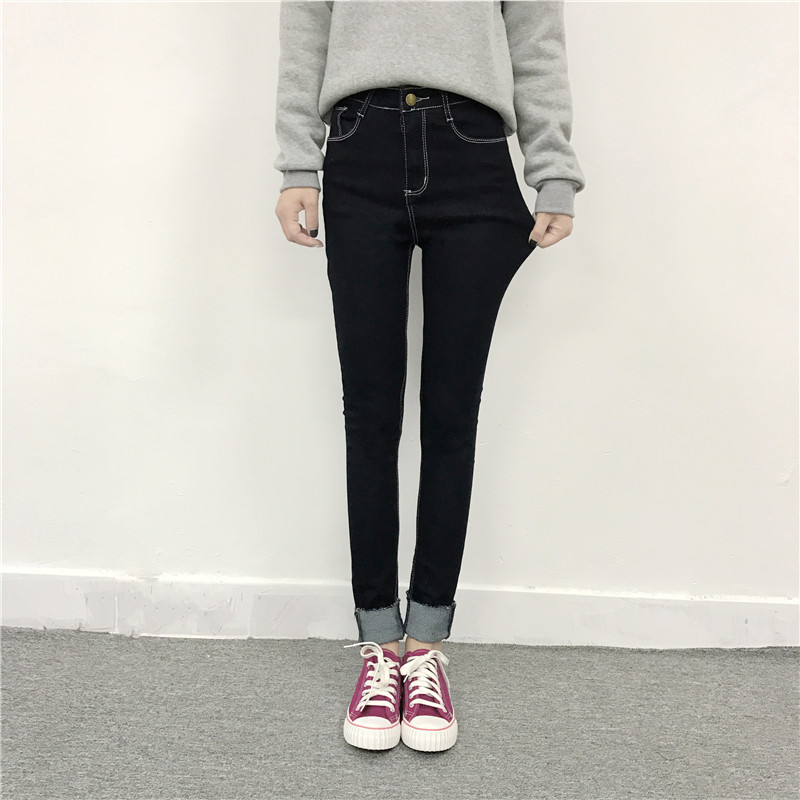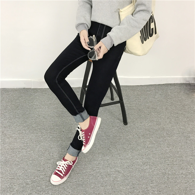 秋冬款韓國卷邊白線撕邊貓須褲腳小腳鉛筆褲牛仔褲女彈力長褲