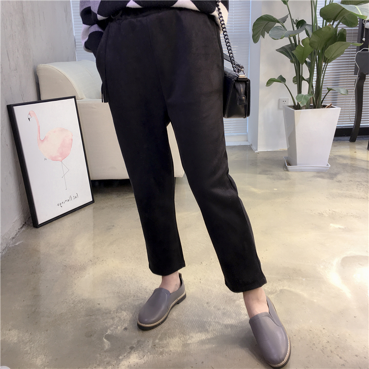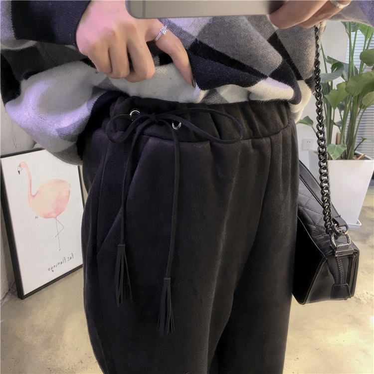 顯瘦的哈倫版型,整體小寬松,因為麂皮絨很厚實,所以褲子的版型很挺括