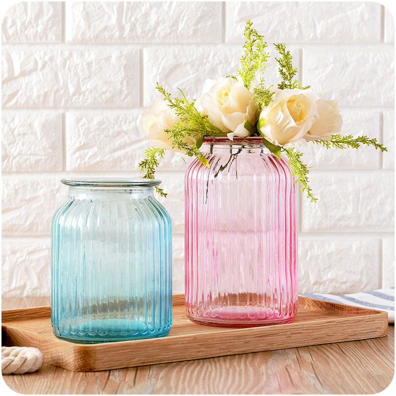 / 歐式彩色玻璃干花瓶家居簡約風擺件客廳創意透明鮮花瓶定制豎紋厚