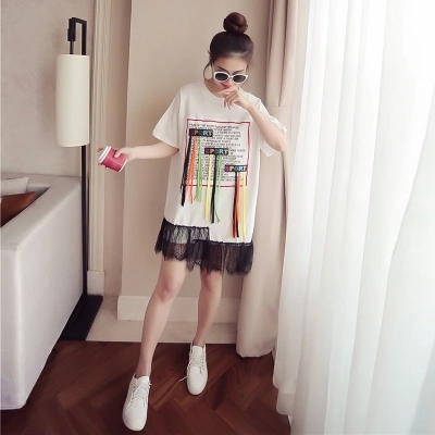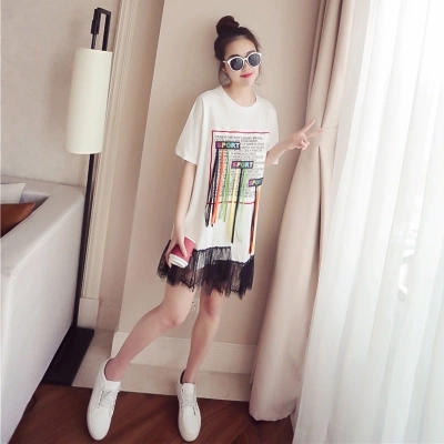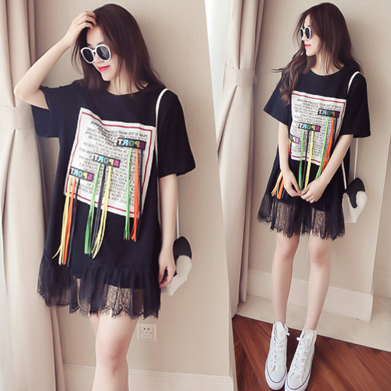 大碼女裝胖MM顯瘦200斤中長款T恤拼接網紗連衣裙假兩件套套裝裙夏