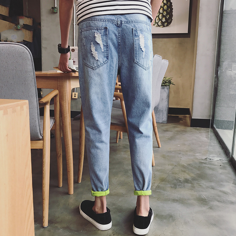 / 男裝韓版破洞牛仔九分褲男士修身小腳褲牛仔褲男褲