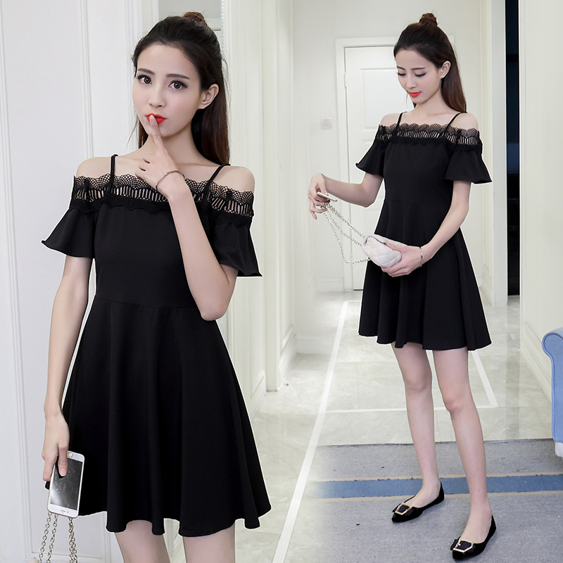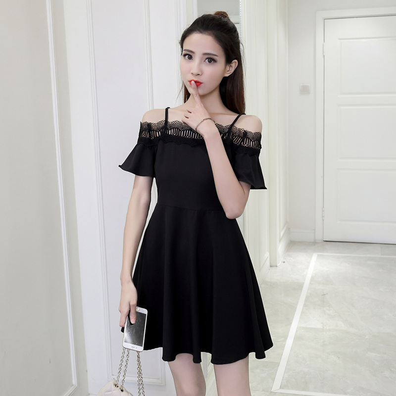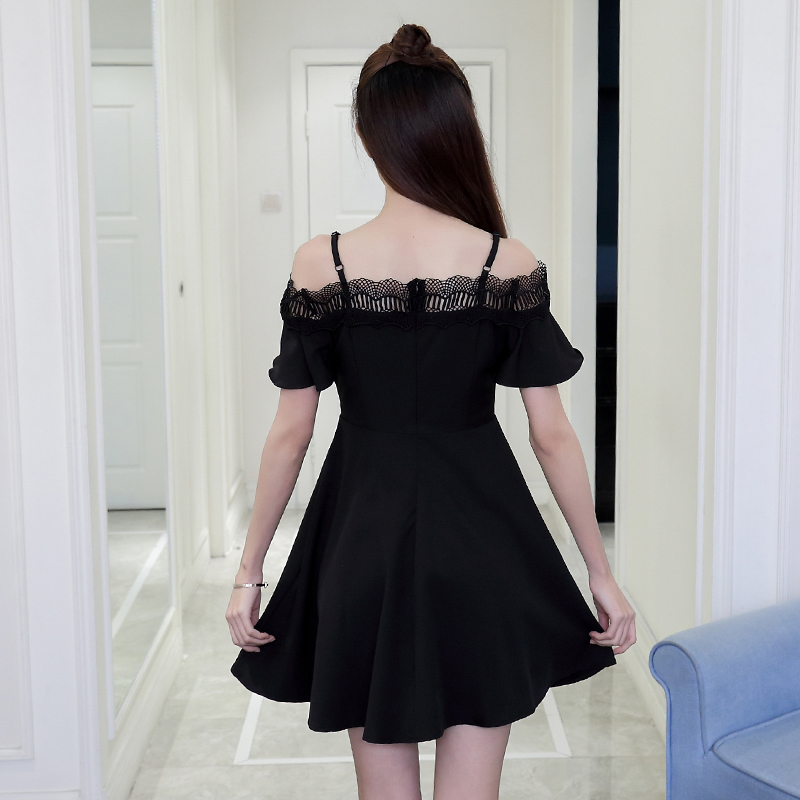 新款女裝韓版蕾絲拼接吊帶露肩小黑裙修身一字領短袖連衣裙夏