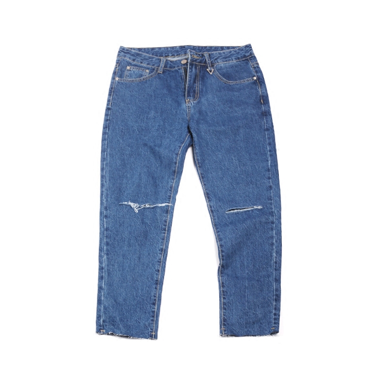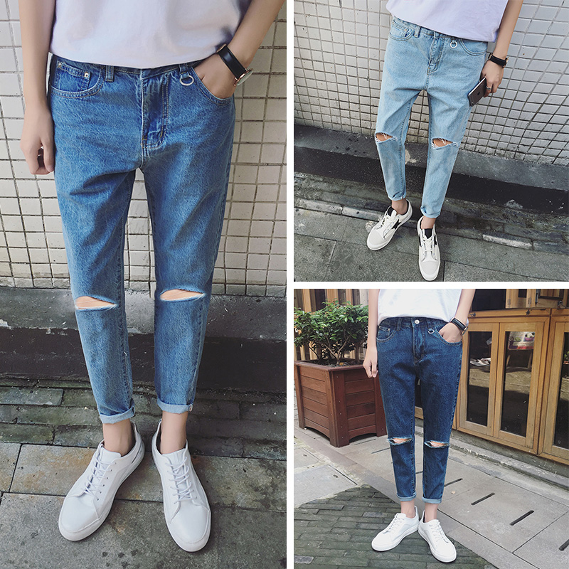 / 港風男裝膝蓋破洞簡約小直腳修身九分褲日韓牛仔褲