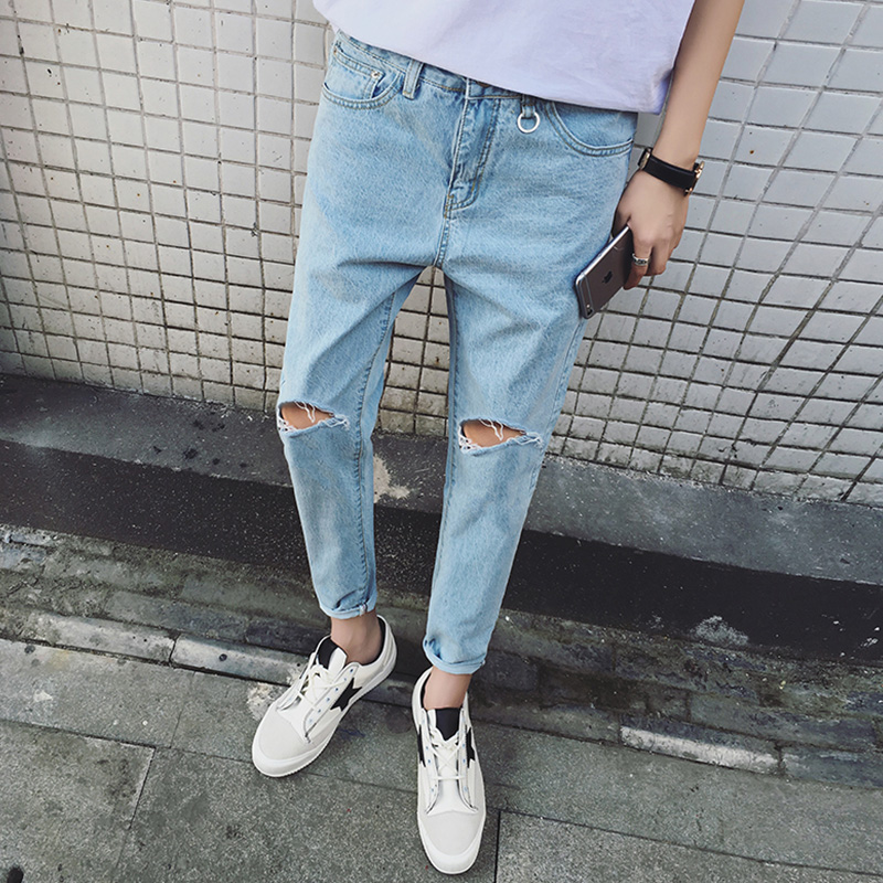 港風男裝膝蓋破洞簡約小直腳修身九分褲日韓牛仔褲