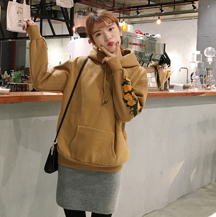 / 冬款韓國復古學院風花朵刺繡套頭加絨加厚寬松連帽抽繩衛衣女