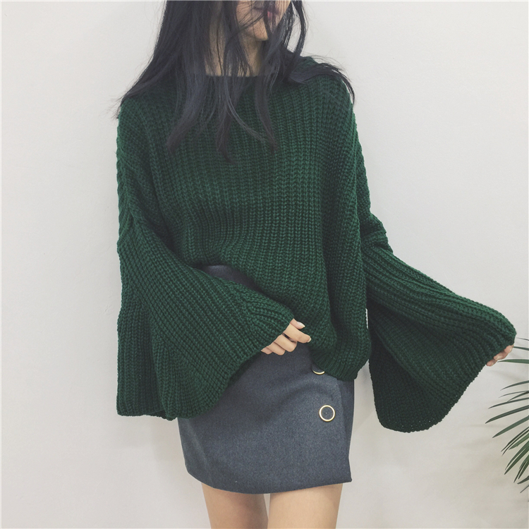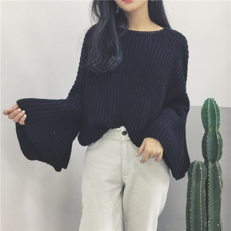 / 秋款韓國寬松顯瘦純色百搭圓領套頭喇叭袖長袖上衣毛衣女