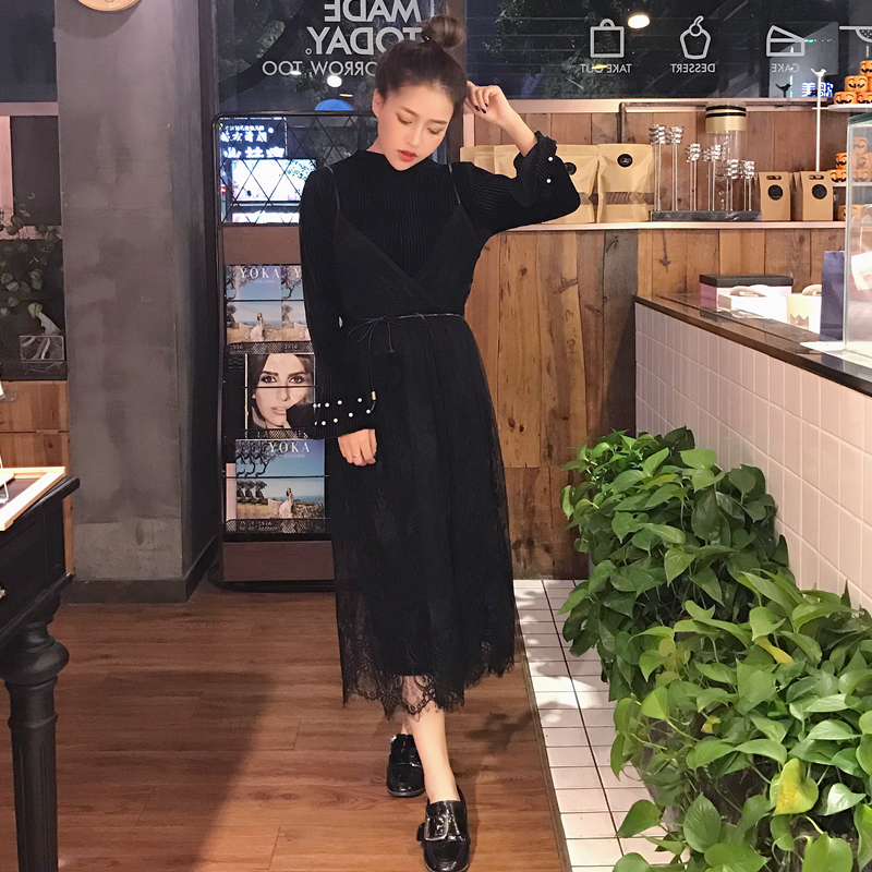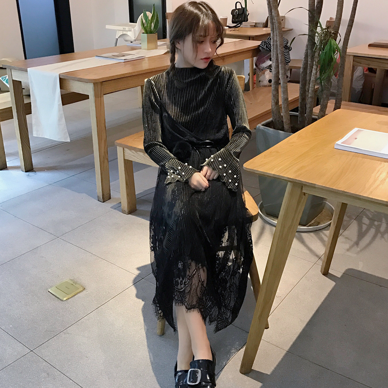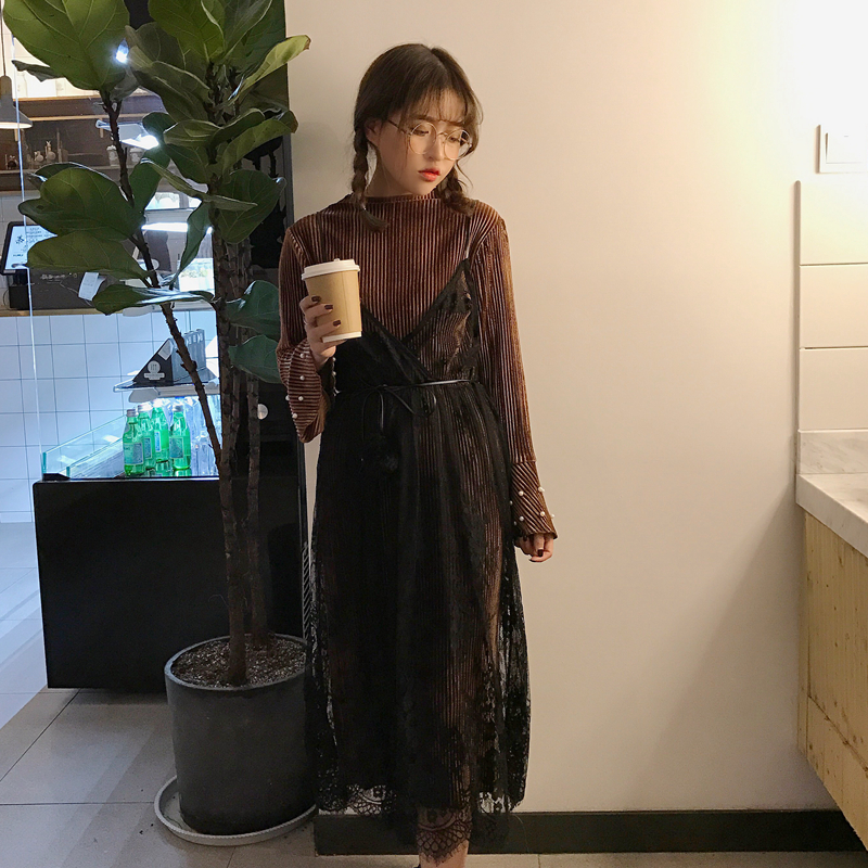 金絲絨連衣裙+蕾絲吊帶裙兩件套
