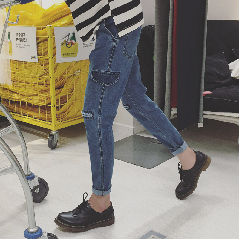 / 秋季新款韓版口袋破洞修身水洗小褲腳男士牛仔褲