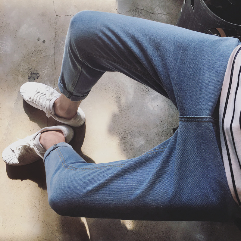 原創經典百搭韓版修身小腳男士淺色九分錐形牛仔褲