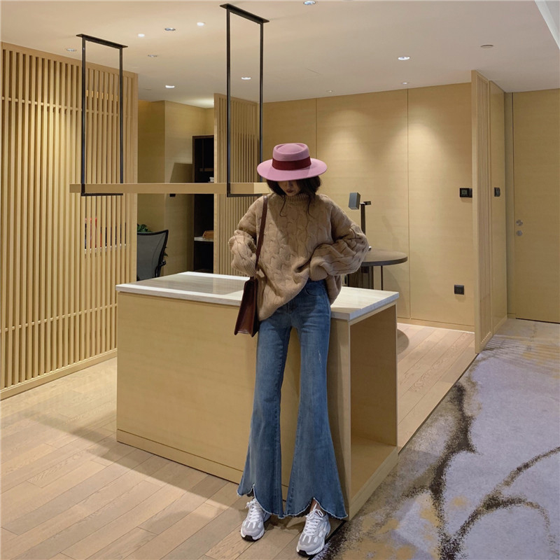 褲子女新款韓版chic時尚復古氣質喇叭褲高腰顯瘦不規則牛仔長褲潮