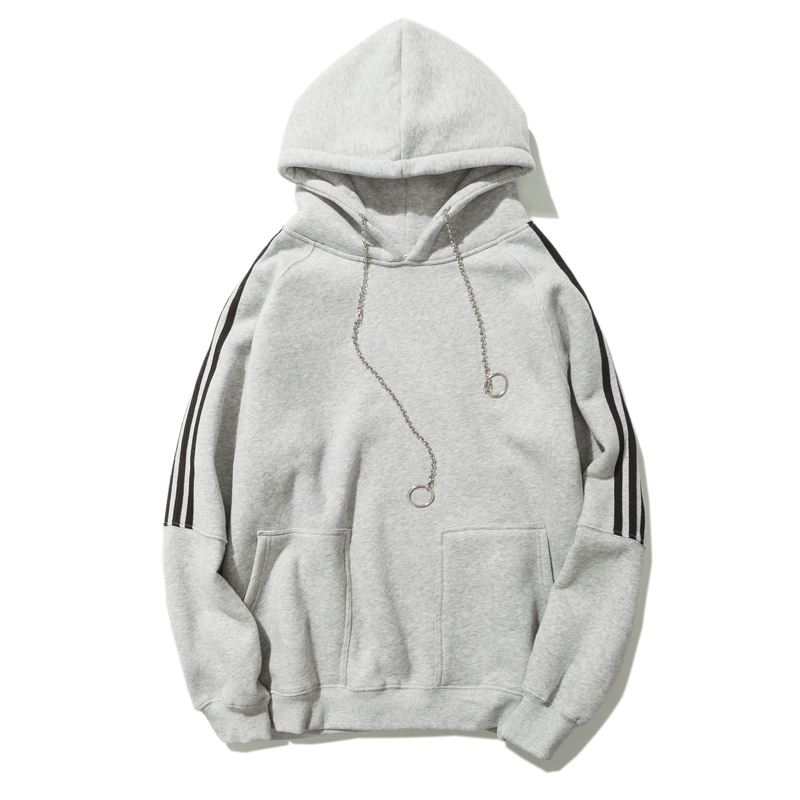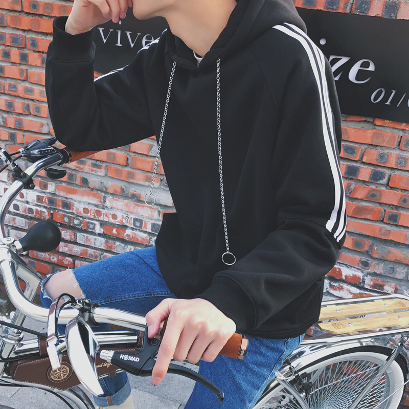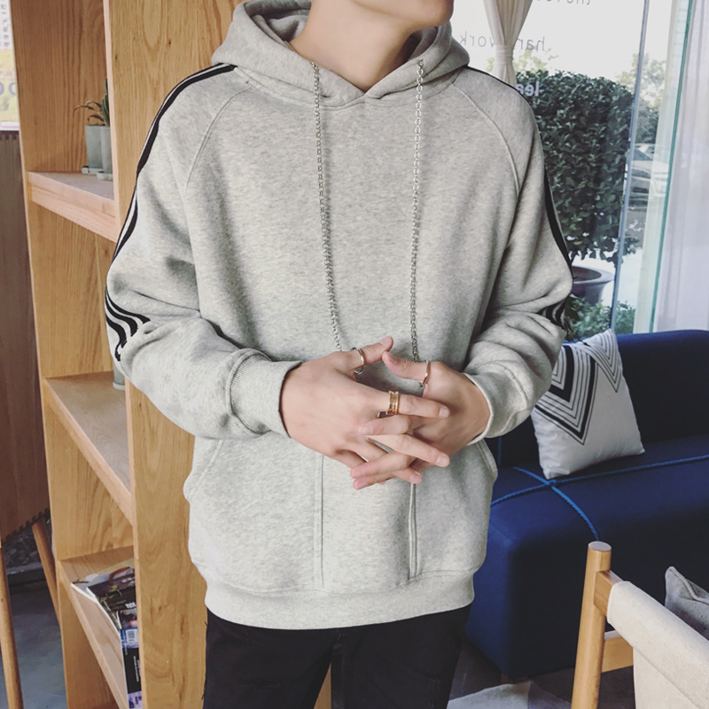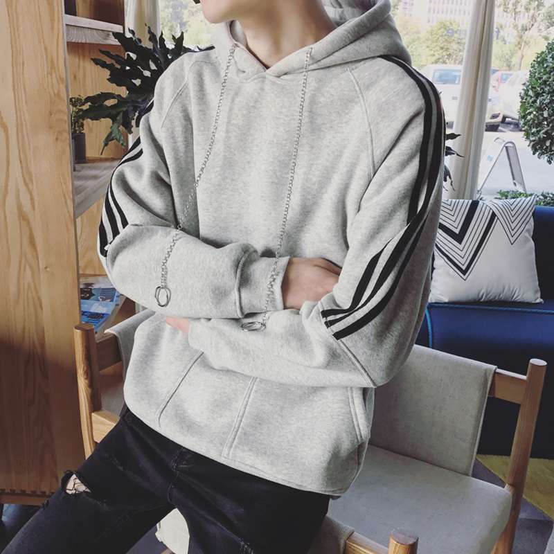 / 男裝韓版加絨三條杠運動套頭衛衣連帽拉絨寬松衛衣