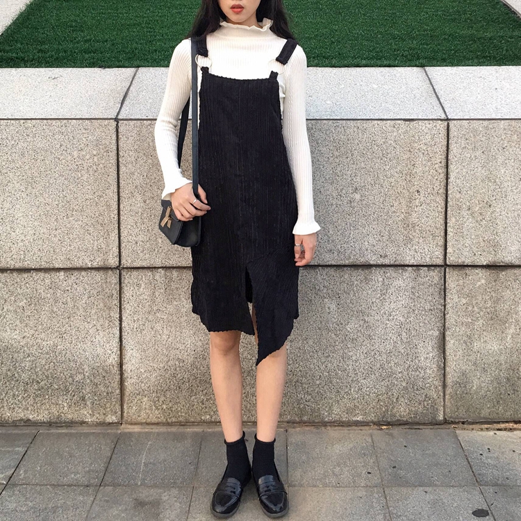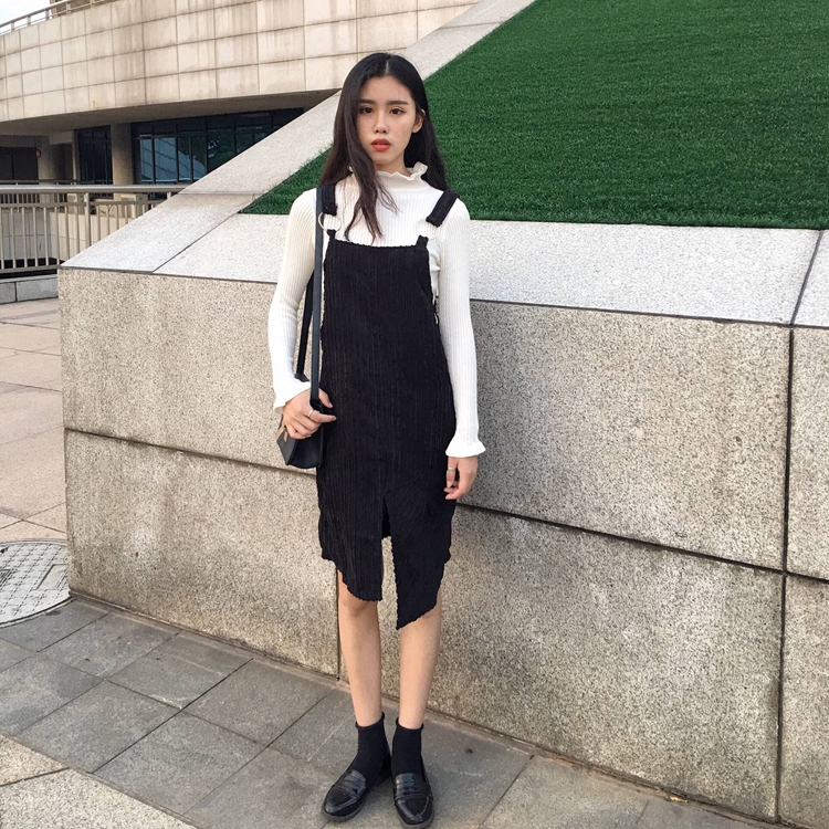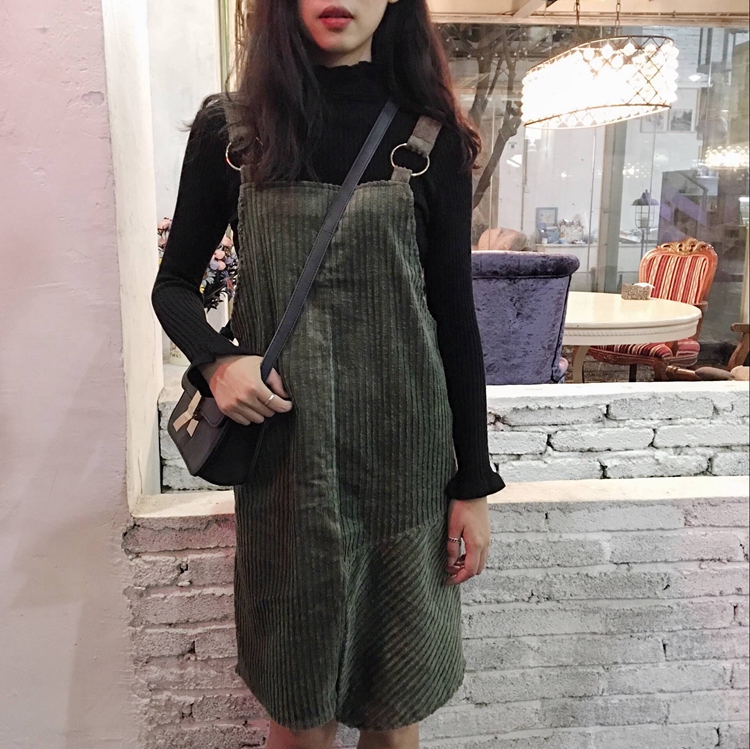 / 韓國chic復古秋冬款寬松開叉燈芯絨坑條純色無袖背帶連衣裙女