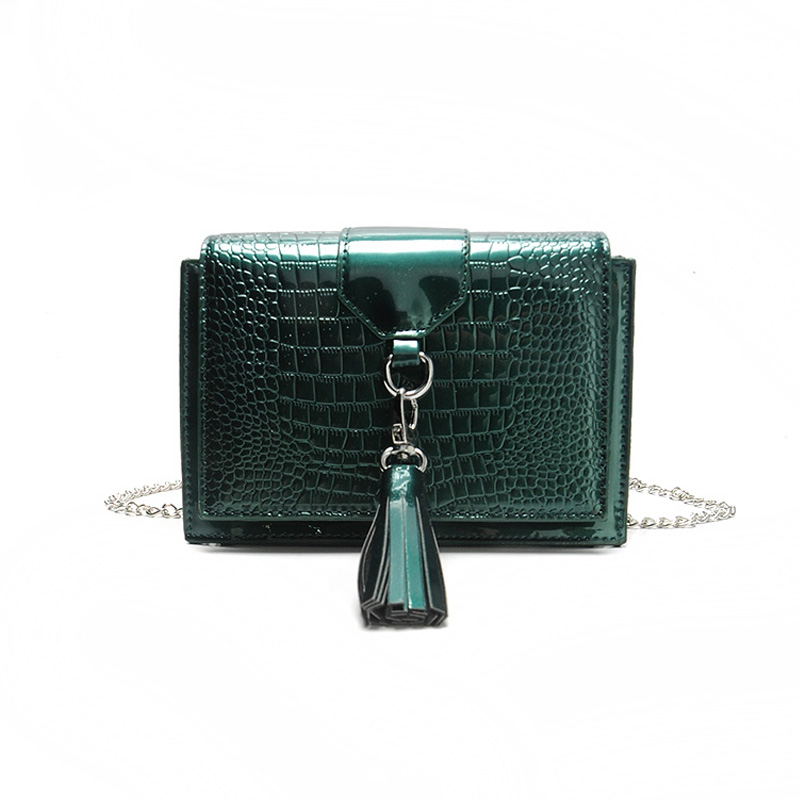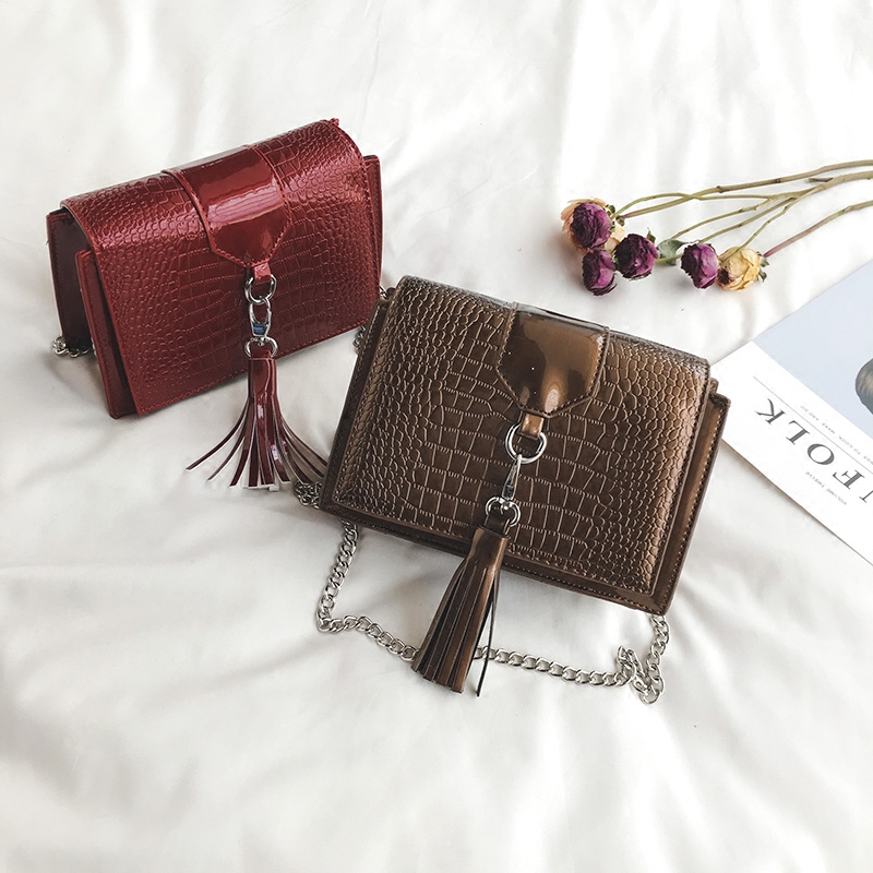 新款潮漆皮鱷魚紋鏈條小方包流蘇單肩女包韓版斜挎包女小包包