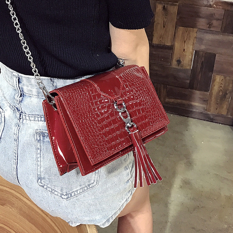 / 新款潮漆皮鱷魚紋鏈條小方包流蘇單肩女包韓版斜挎包女小包包