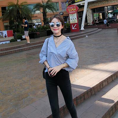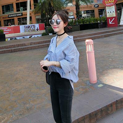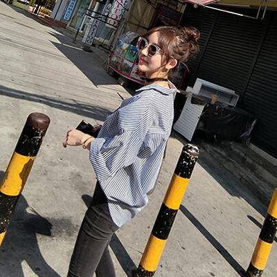 / 襯衫女長袖2017春裝新款夏韓版寬松藍色中長款藍白豎條紋襯衣外套