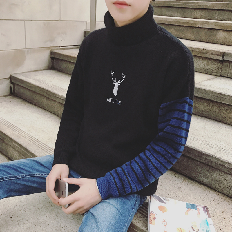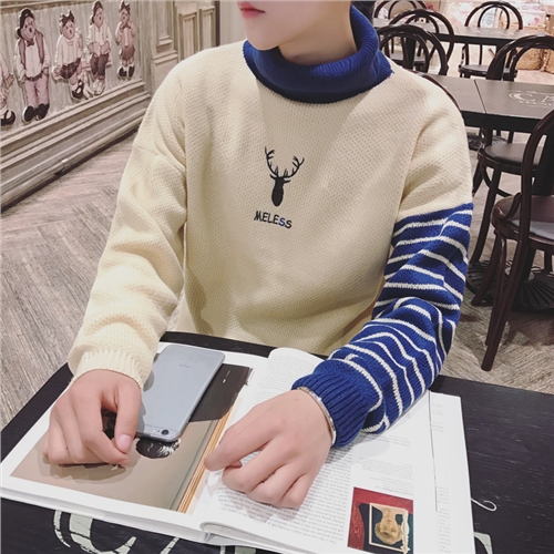 男裝小鹿刺繡高領撞色針織衫高領寬松套頭男士毛衣