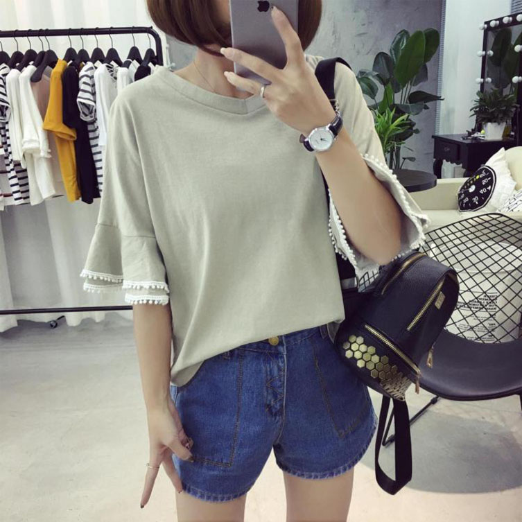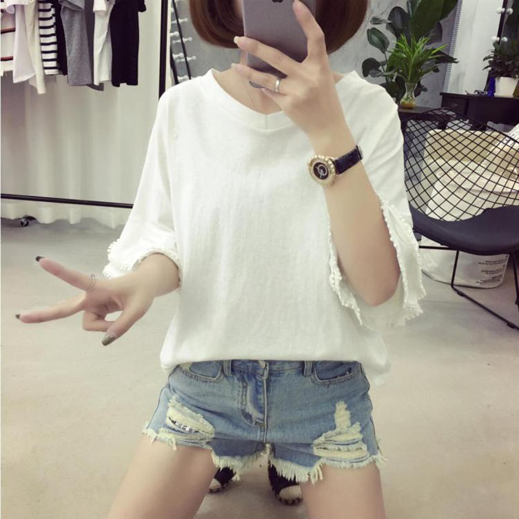 / 夏季韓范寬松喇叭袖t恤女簡約V領短款打底衫大碼短袖t恤個性上衣