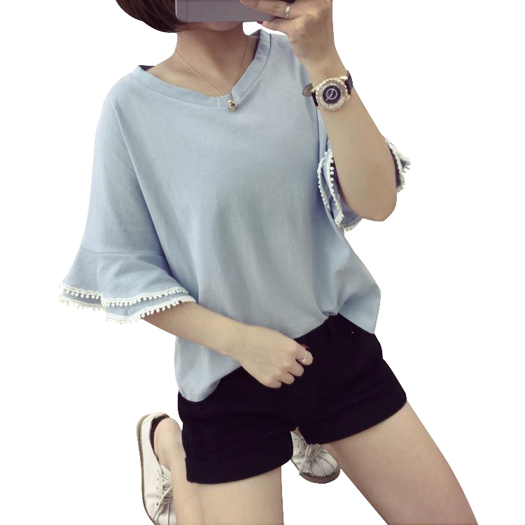 夏季韓范寬松喇叭袖t恤女簡約V領短款打底衫大碼短袖t恤個性上衣