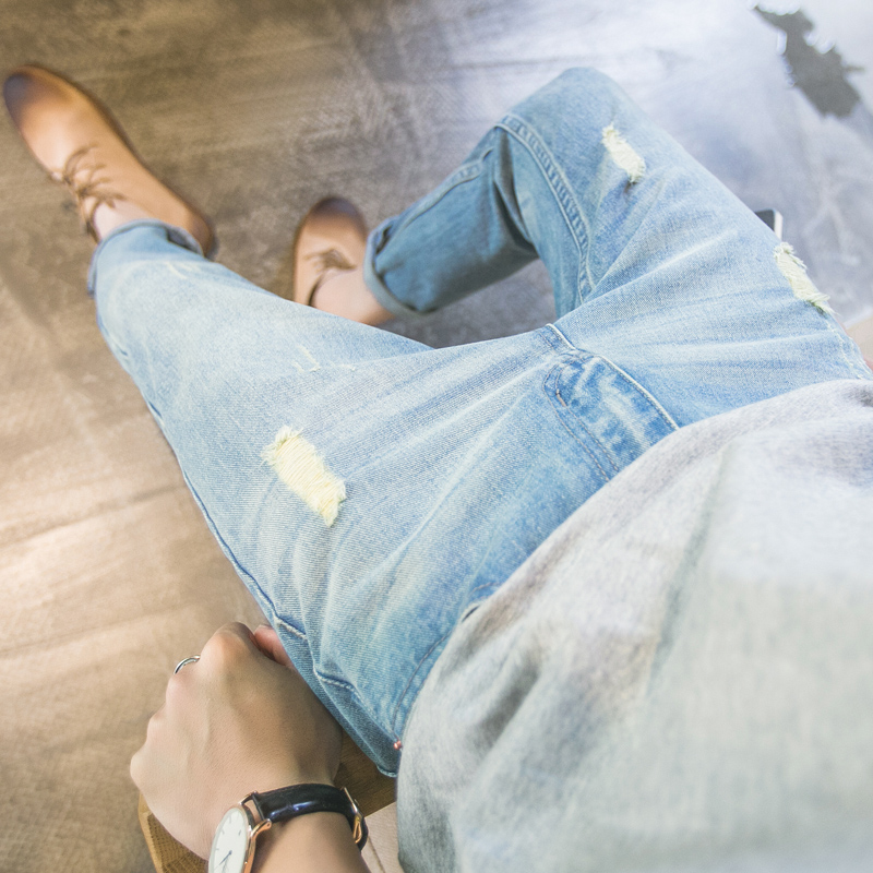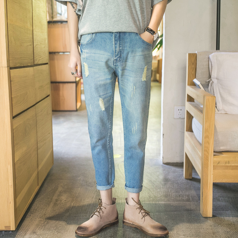 / 原創新品破洞貓須潮男日系小直腳牛仔褲韓版九分褲