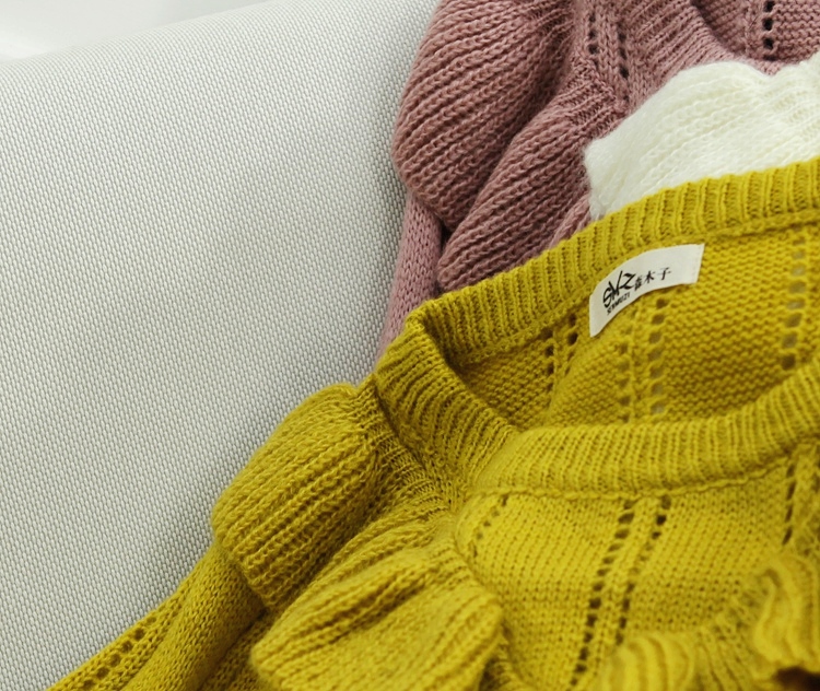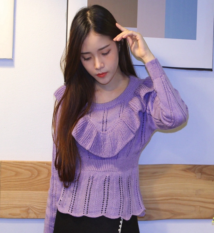 秋冬韓國甜美學院荷葉邊圓領波浪縷空寬松套頭粗針毛線毛衣女