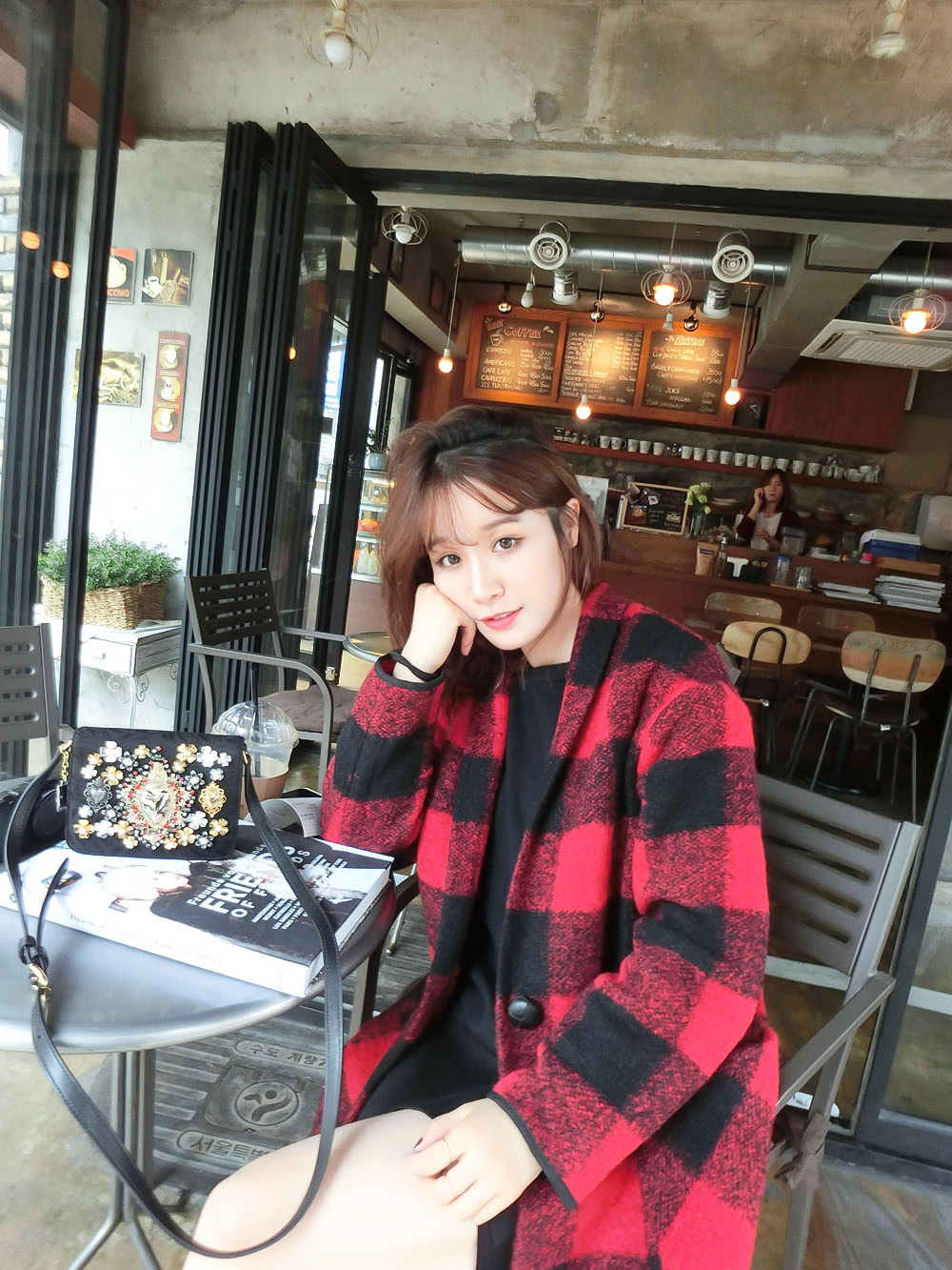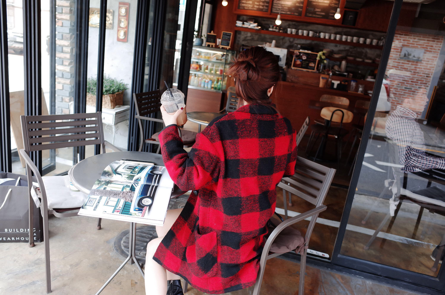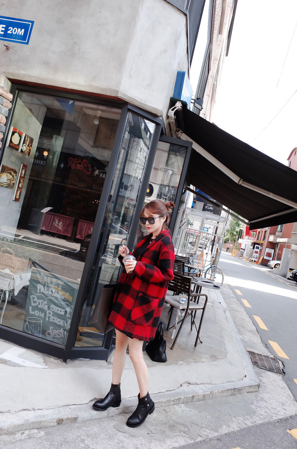 / 秋季韓國復古寬松顯瘦百搭格子長袖中長款毛呢大衣外套女