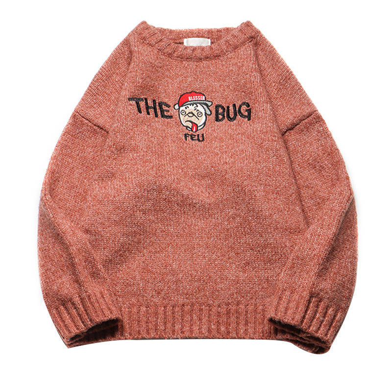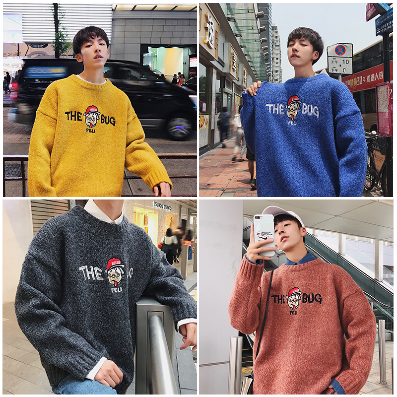 文藝男女店圓領刺繡毛衣男士秋季潮流針織衫冬季男裝韓版寬松外套