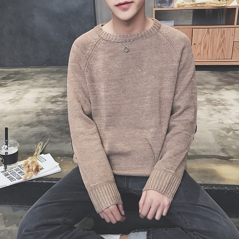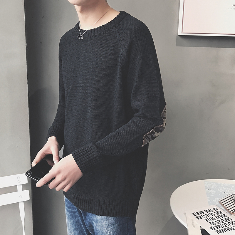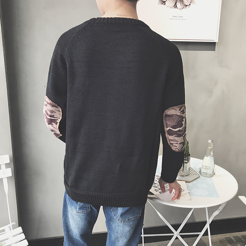 / 男裝迷彩袖貼布韓版寬松圓領男士套頭針織衫毛衣