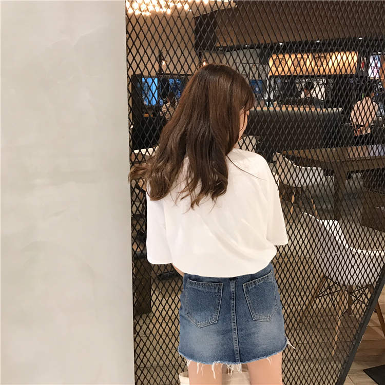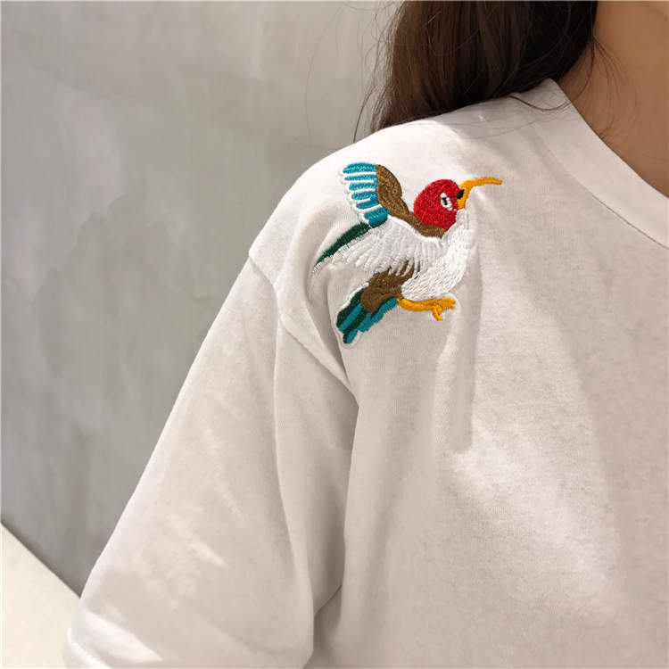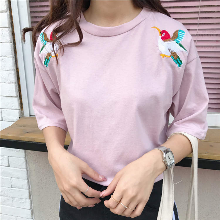 / 夏季新款韓版寬松圓領飄帶字母刺繡粉色t恤女短袖學生百搭上衣潮