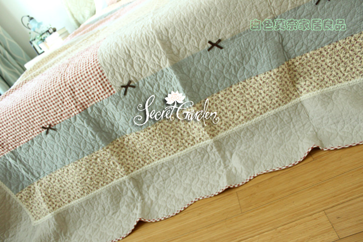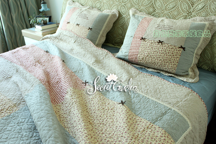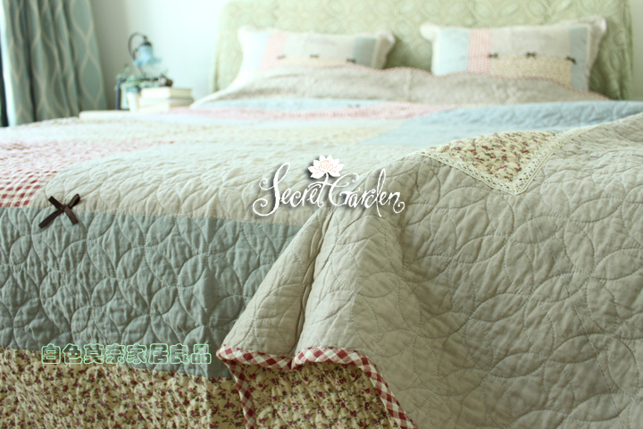 【用法】主要是作為床蓋,即按西式鋪床的方法,被子等整理平鋪好之后,上面再搭床蓋,讓床顯得整潔美觀,可以把整個床罩住,如為單張床蓋,蓋住枕頭時,可再往枕頭下邊稍微往里窩一下;也可以將床蓋折成兩折或三折搭在床的下半部分,亦或是不經意地隨意搭著。因為填充物為水洗棉,外覆亦為棉布,厚度相當于空調被,夏天或春秋天也可以當薄被使用,但一般需要在內里襯一張被單,比較講究的,多選擇有一側花邊的被單,將花邊一側翻露在外面,留二三十公分;這樣也有助于保持清潔。內襯的被單,可選擇小店的美單高支紗一側蕾絲的款式,也可選擇玫瑰花一側盤帶的白色款式,抑或是即邊的款式。