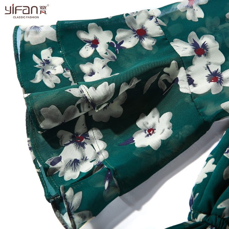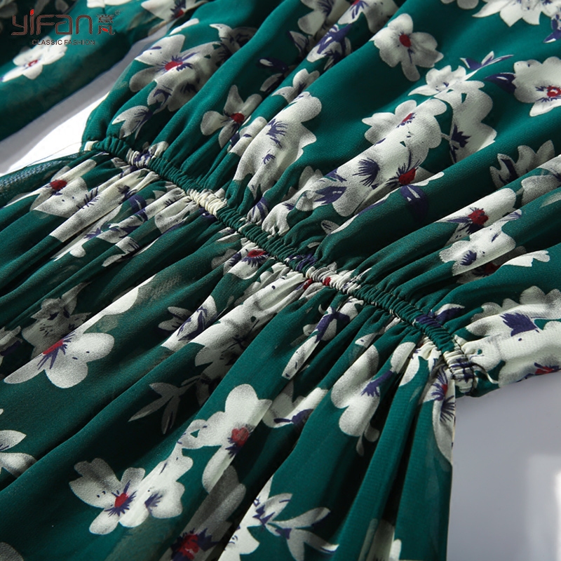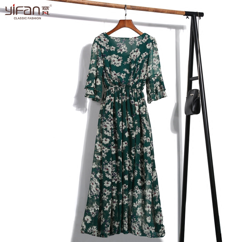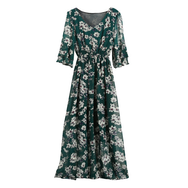 / 夏季新款波西米亞度假沙灘裙碎花喇叭袖V領雪紡連衣裙女長裙