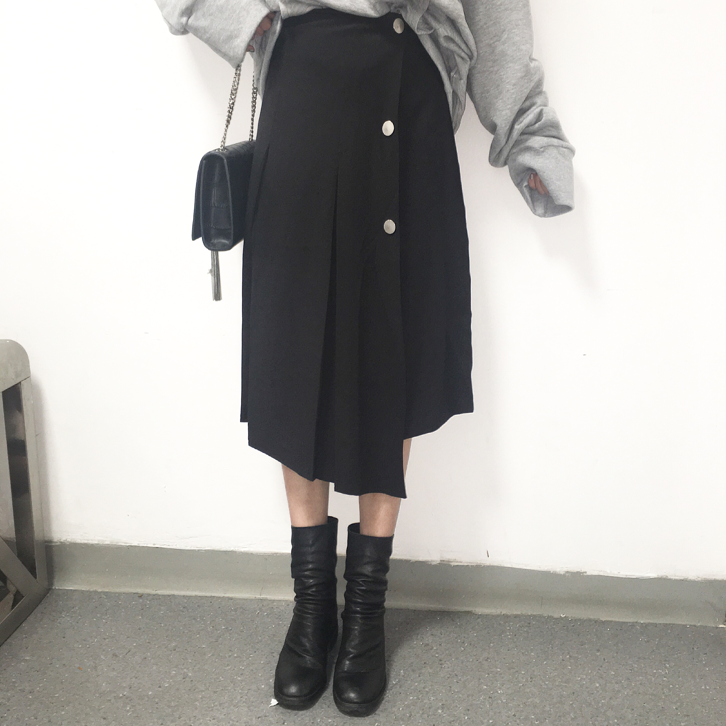 高腰百褶的設計拉長身高比列 (實物顏色是黑灰色 偏黑基本上屬于黑色)