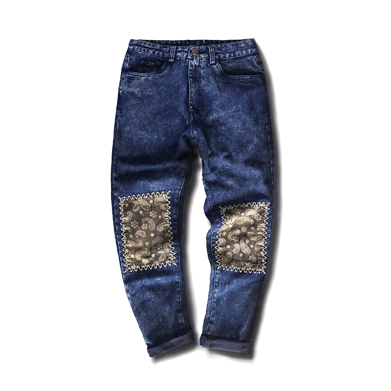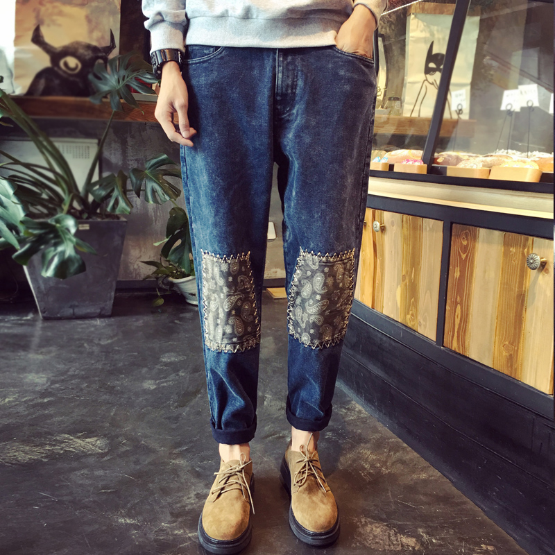 / 原創膝蓋日系腰果花潮男哈倫褲秋新小腳牛仔長褲男