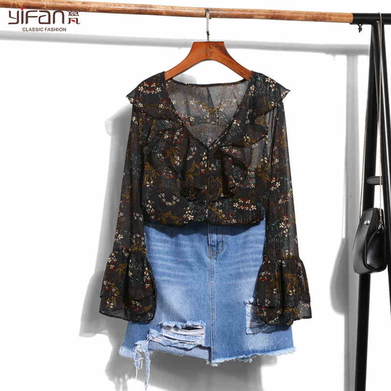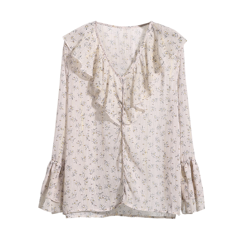 韓國東大門新款荷葉邊雪紡衫喇叭袖新款荷葉邊V領上衣碎花襯衫夏