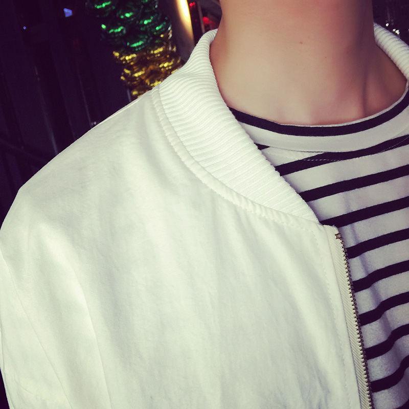 這款夾克有點擴版型。落肩設計。棒球領設計。都是今年韓風最流行的元素。