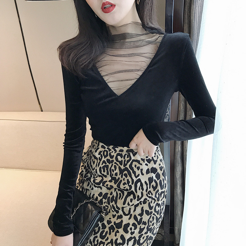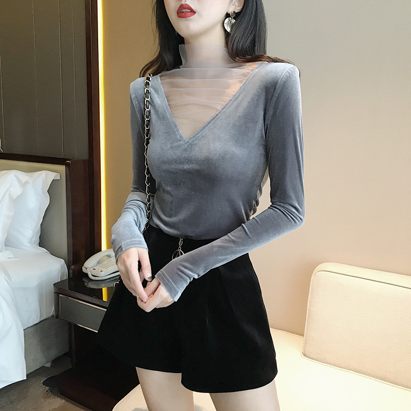 / 秋冬新款韓版上衣女裝修身顯瘦打底長袖設計感V領網紗拼接絲絨T恤