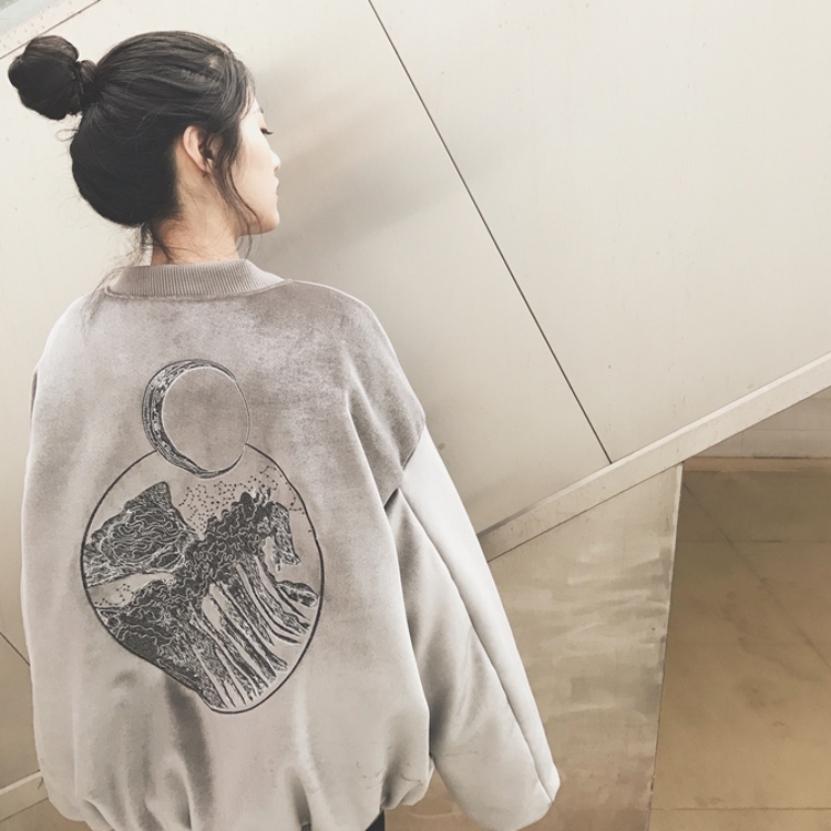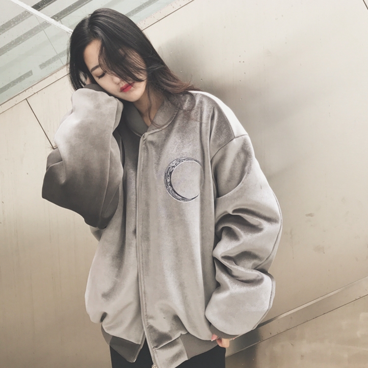 / 韓國冬款重工刺繡寬松夾棉絲絨中長款保暖棒球服學生外套女