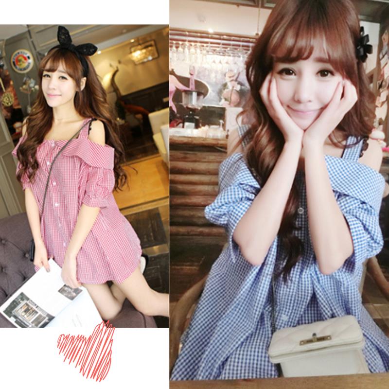 / 歐洲站2017夏裝新款歐貨韓版一字領吊帶裙女顯瘦格子中長款連衣裙